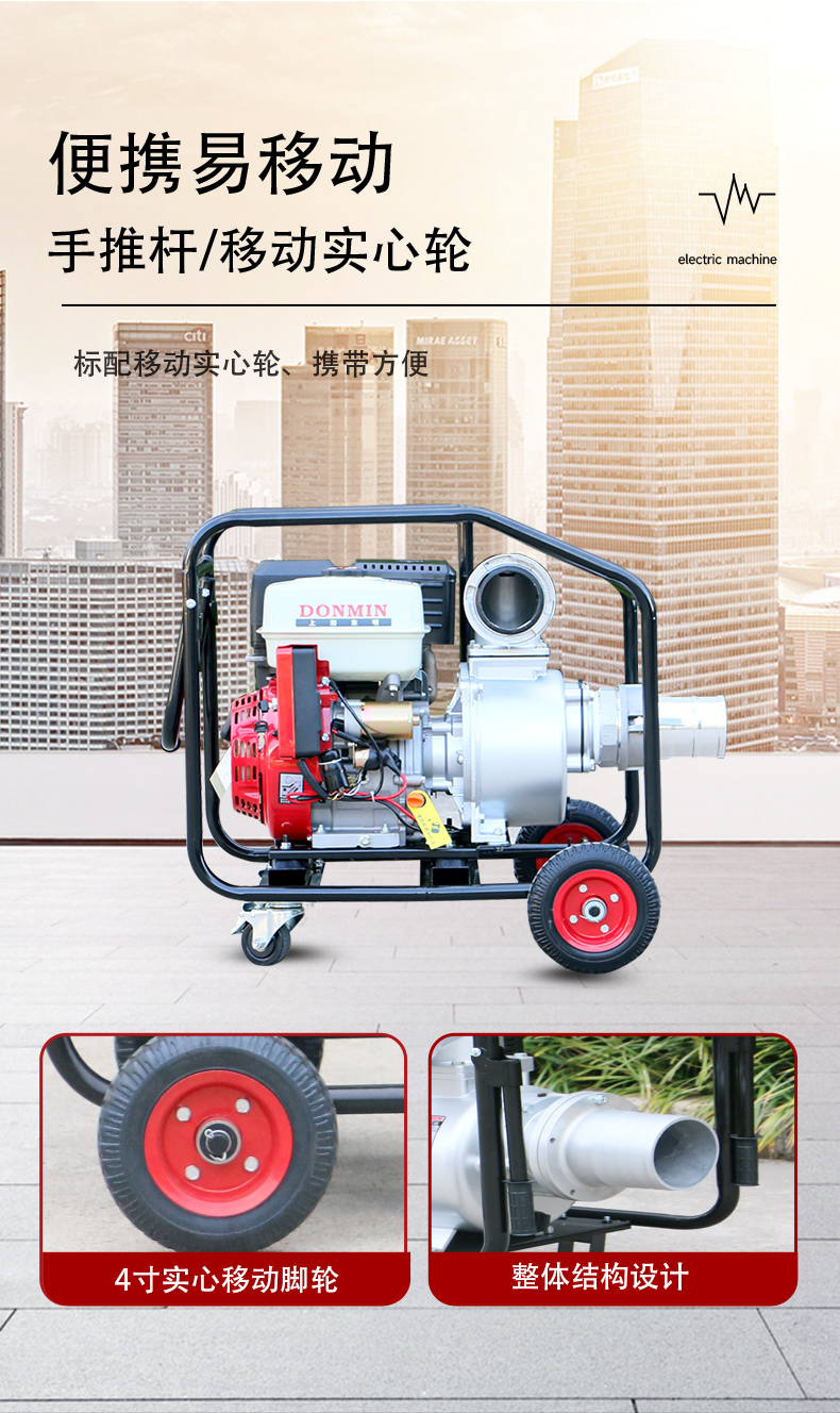 DM40YJ 出厂时已配备 20 米排水水带和 6 米进水管,快速接口实现快速拼接管路。设备配备 2 个定向轮和 2 个万向轮,搭配可折叠手拉杆,单人即可推动至积水点。同时,机身设计轻量化(净重仅 83kg),通过铁路作业车运输后,可快速搬运至指定位置,大幅缩短准备时间。