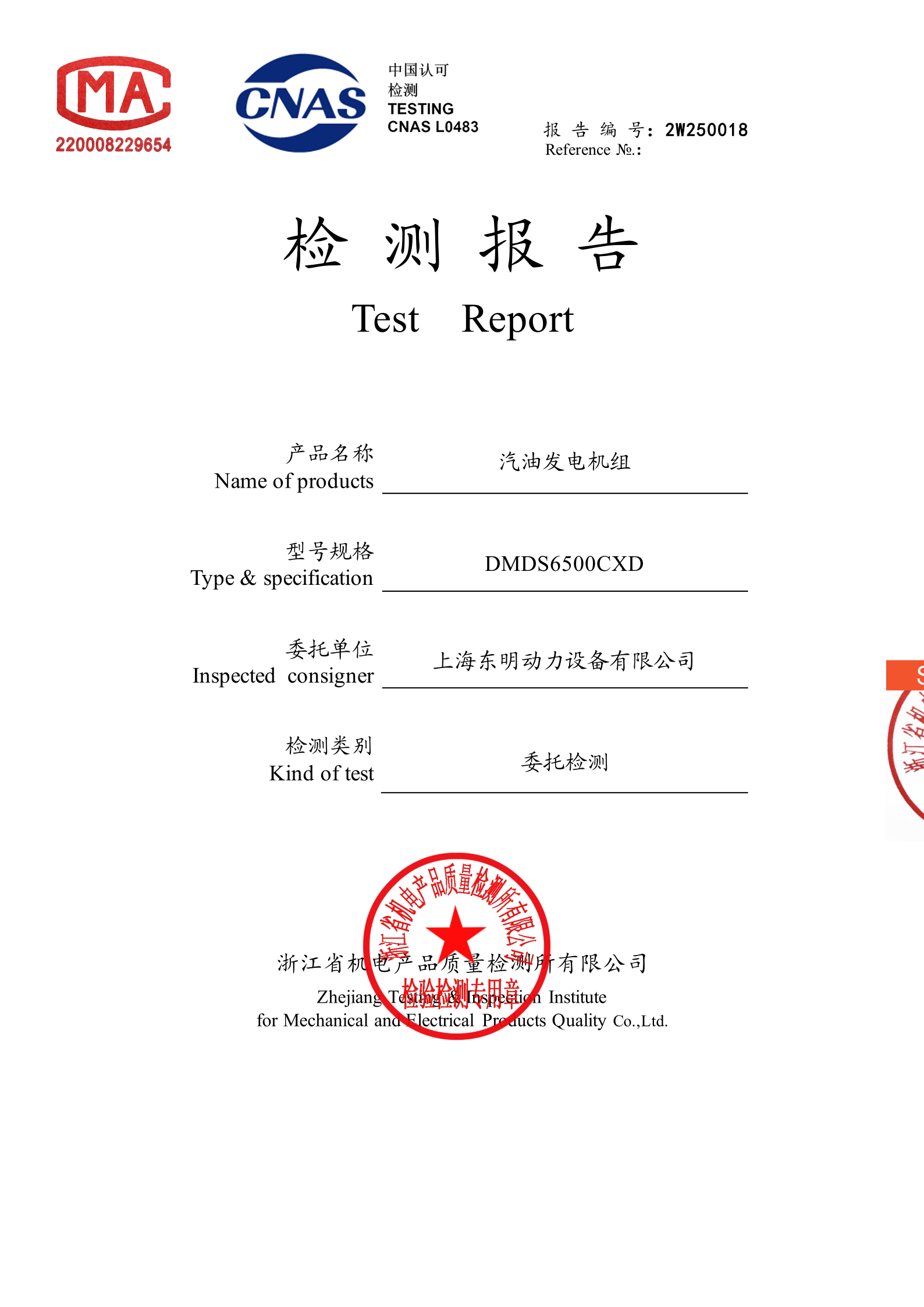 作为专业发电设备,上海东明 DMDS65000CXD 已通过检测机构浙江省机电产品质量检测所检测认证,具备完整的检测报告,在品质把控上表现突出: